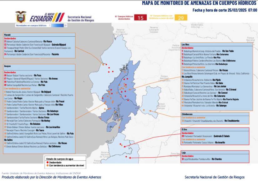 Hasta las 07:00 del 25 de febrero, la Secretaría Nacional de Gestión de Riesgos (SNGR) informó que 15 ríos están desbordados y han causado afectaciones a la población. Estos se ubican en las provincias de Guayas, Manabí, Loja, El Oro y Los Ríos, que han registrado intensas precipitaciones en los últimos días.