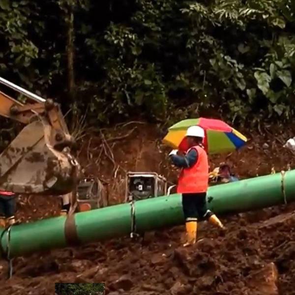 Decenas de personas trabajan con maquinaria pesada para reemplazar la tubería y evitar que se derrame el petróleo. El 17 de junio, OCP suspendió el bombeo de crudo para construir aquí dos nuevos bypass.