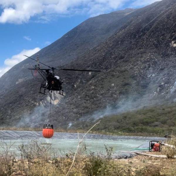 Un helicóptero de las Fuerzas Armadas arribó a la zona para el abastecimiento de agua con el dispositivo bambi bucket para apoyar en las labores.