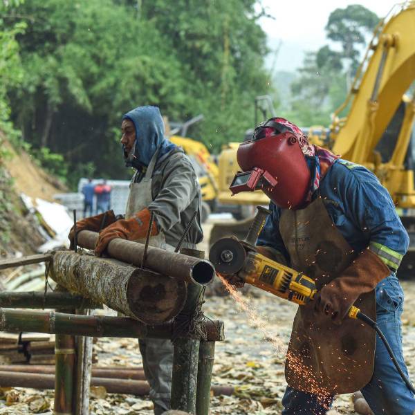 Dos obreros trabajando en la construcción del puente bailey. ( )