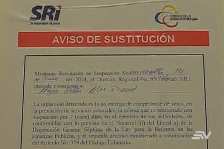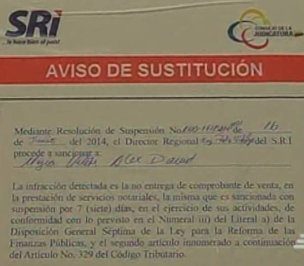 Era un operativo conjunto, funcionarios del Servicio de Rentas Internas (SRI) y del Consejo Nacional de la Judicatura visitaron distintas notarías a nivel nacional para comunicarles que en días pasados se realizaron en ellas compras simuladas y que por esas operaciones no recibieron los respectivos comprobantes de venta. La sanción consiste en una clausura por siete días de aquellas notarías que imcumplieron, pero como los servicios públicos no pueden interrumpirse desde la Judicatura desarrollan una alternativa, según expresó su director regional en el Litoral, Bolívar Vergara. “Tengan la certeza de que los servicios no serán interrumpidos, pues los hemos encargado a los notarios más cercanos”.