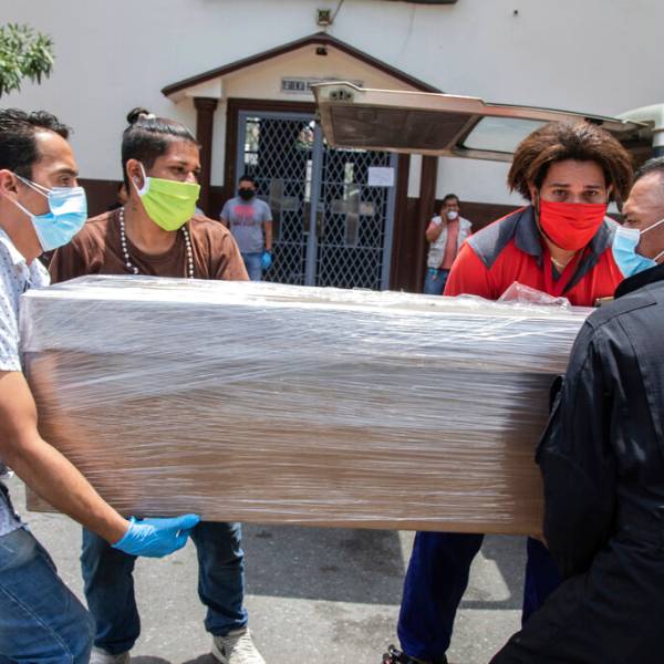Una persona muerta es sacada de una iglesia por familiares, en un ataúd de cartón. Foto: AP