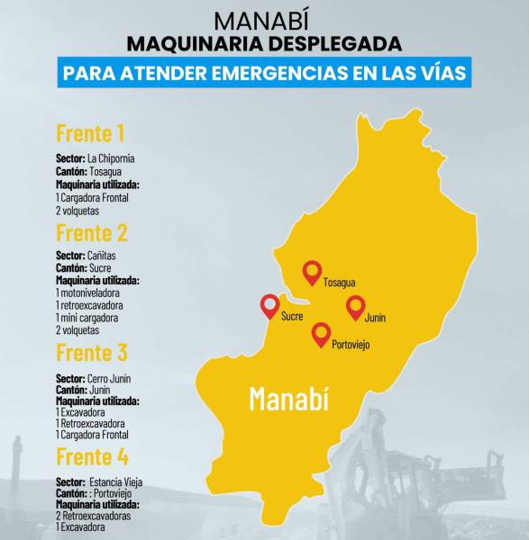 En Manabí, maquinaria de la secretaría de Estado y del GAD de Pedernales realizó el 3 de marzo la limpieza y desalojo de escombros en la vía (E382) El Carmen - Pedernales, km 73, sector Estero Seco. En la provincia también se dispuso la contratación inmediata de maquinaria para la limpieza de alcantarillas, cunetas, despeje de caudales de ríos y derrumbes en otros tramos de la Red Vial Estatal.