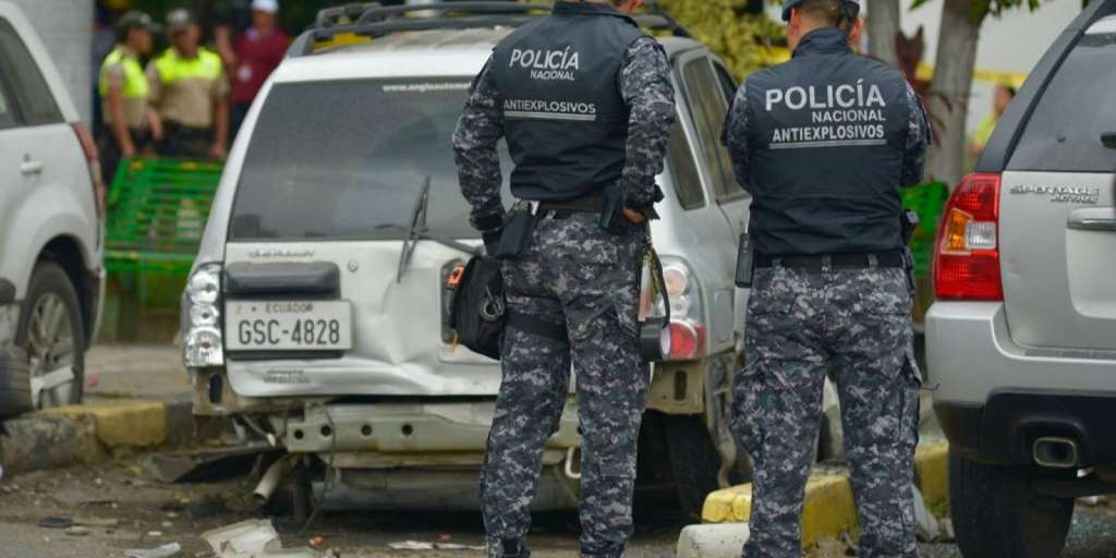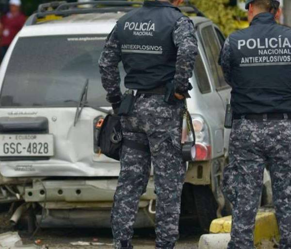 Policías ven unos de los carros que explotó en la Universidad de Guayaquil. Foto: Archivo API