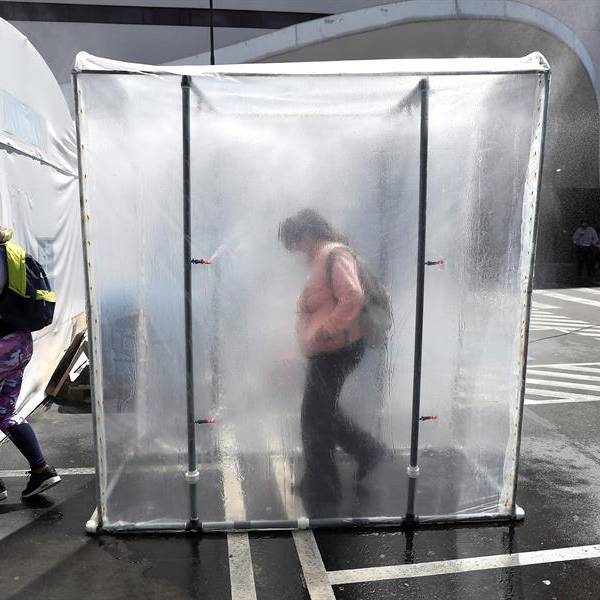 Personas pasan por una cabina de desinfección para ingresar al área de triage este lunes en el hospital de Less, en Quito. EFE
