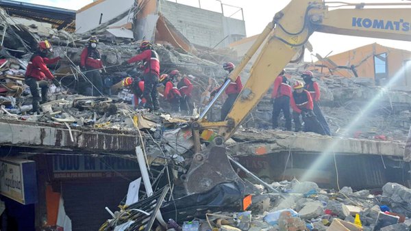 Efectivos del Cuerpo de Bomberos de Quito realizan tareas de búsqueda y rescate en la parroquia Tarqui, Manta / Manabí. Foto: Bomberos Quito