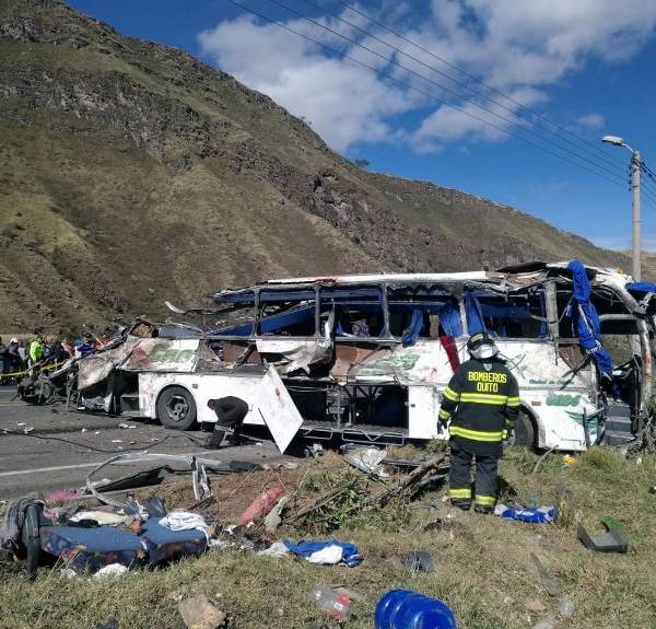 El accidente ocurrió la mañana del martes cuando un autobús turístico que había partido con unos 40 ocupantes -la mayoría colombianos- chocó con otro vehículo en el sector de Palugo, a unos 30 kilómetros al este de la capital ecuatoriana.
