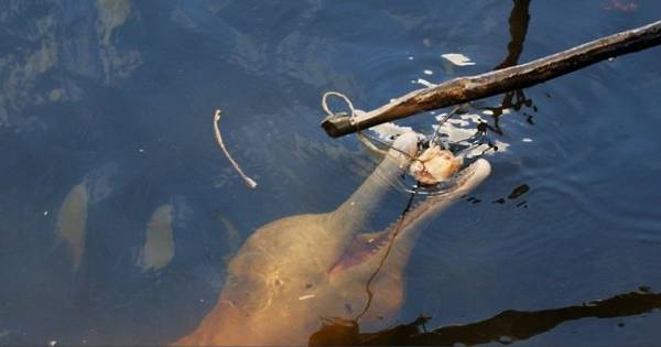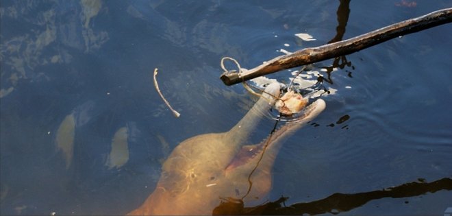 A los delfines rosados, únicos en el mundo y que habitan en la cuenca del Amazonas hay que enseñarles la carnada y esperar a que tomen confianza.