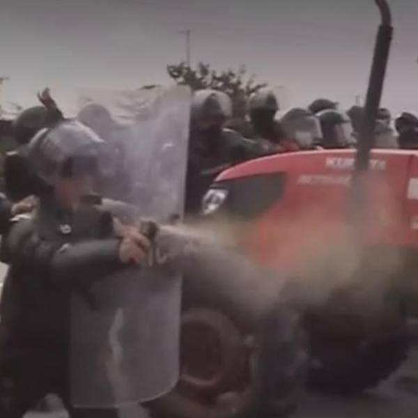 Los agricultores lanzaron piedras y la policía respondió al ataque con gases lacrimógenos que dispersaron a los manifestantes y uno de ellos quedó herido.