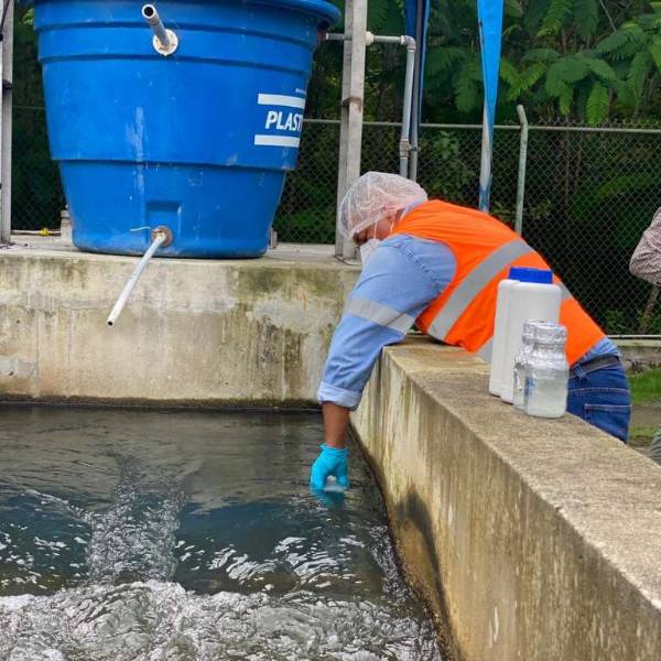 El momento en que se toman muestras de agua del cantón orense. Foto: Tomada de @Larry_vite