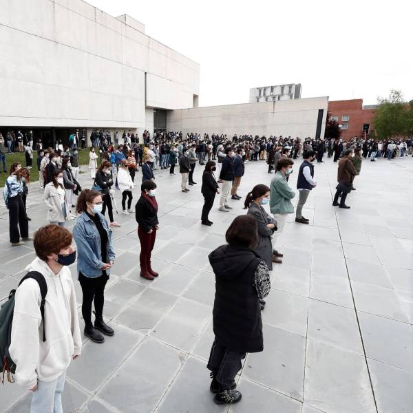 Alumnos y profesores de la Facultad de Comunicación de la Universidad de Navarra guardan un minuto de silencio en memoria del periodista navarro David Beriain Amatriain, asesinado en Burkina Faso junto a Roberto Fraile. EFE/ Jesús Diges/Archivo( )