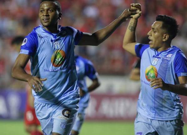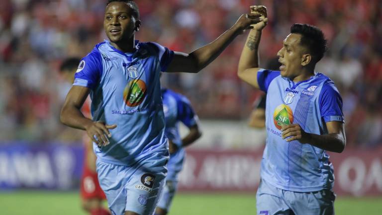 Estrada y Champang festejan un gol de Macará en Sudamericana.