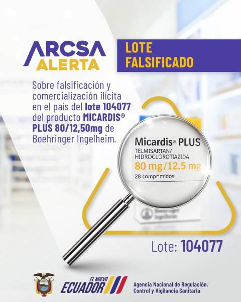 Se trata del lote 104077 de Micardis Plus 80/12,50 mg comprimidos, según informó la empresa Boehringer Ingelheim del Ecuador a las autoridades.
