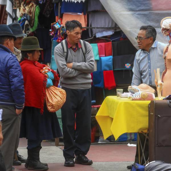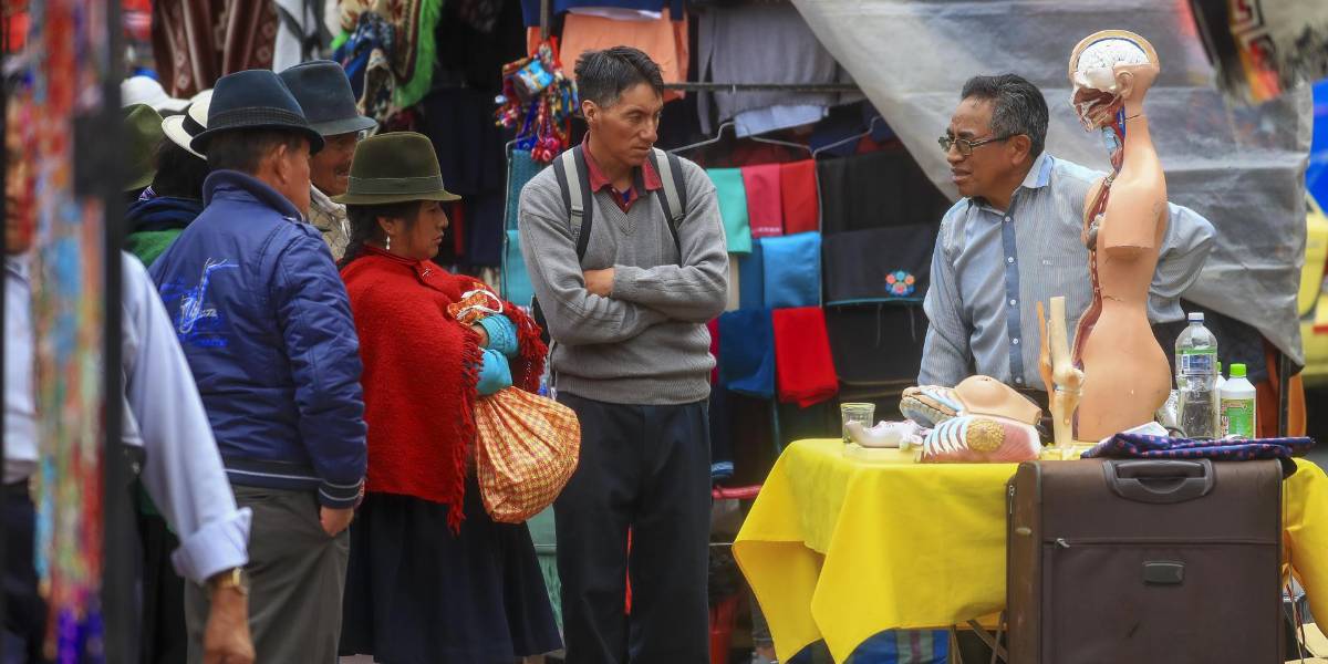 Personas trabajan hoy en relativa normalidad en una calle de la ciudad de Riobamba (Ecuador). ( )