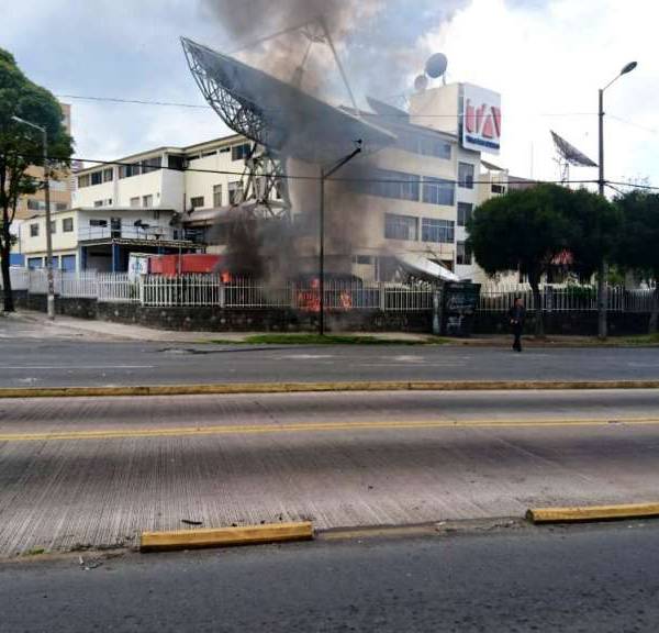 Minutos antes de que entrara en vigencia el toque de queda en la ciudad de Quito y los valles, un grupo de vándalos lanzó bombas molotov a la instalaciones del canal Teleamazonas, la tarde de este sábado 12 de octubre.