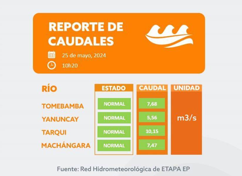 Durante las últimas 48 horas, los ríos aumentaron hasta seis metros su caudal, según el reporte de Etapa, empresa de agua potable de Cuenca. Este 25 de mayo, la entidad anunció un "leve incremento" después de la lluvia registrada durante la madrugada y mañana del sábado, de la siguiente forma: