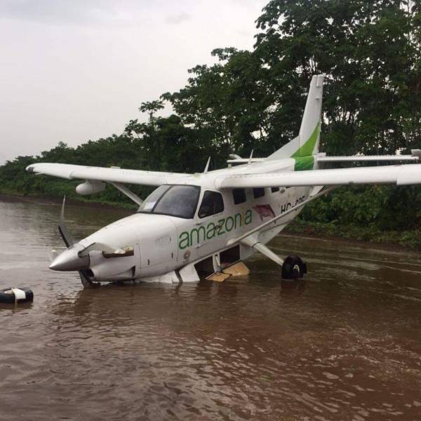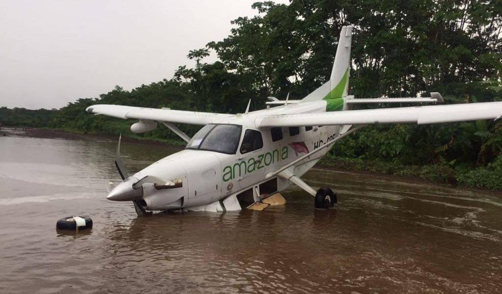 Según información preliminar, la aeronave recorría la pista, que estaba llena de agua, perdió su tren de aterrizaje delantero y se estrelló contra el suelo.