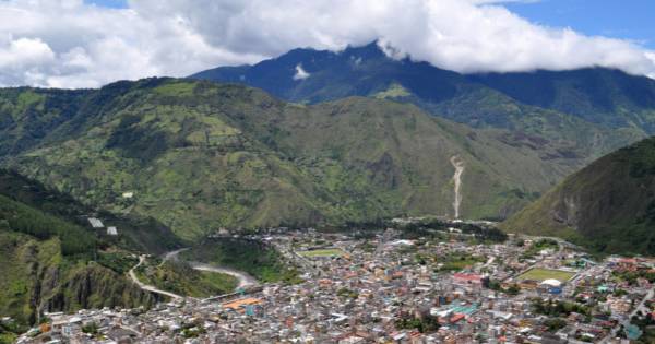 La ciudad turística de está ubicado en un valle con cascadas y aguas termales a lado del volcán Tungurahua con una altura de 5.016 metros.