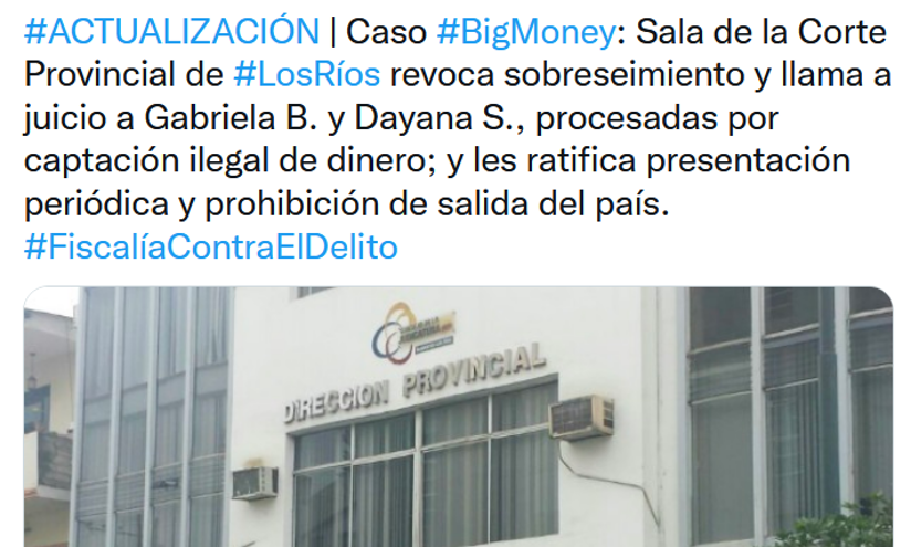Según la Fiscalía General del Estado, en este proceso se demostró que no existía la empresa Big Money y que el monto captado de forma ilícita sobrepasó los diez millones de dólares.