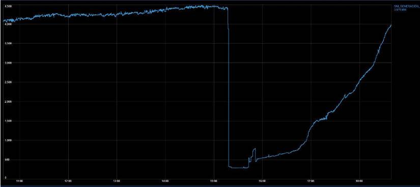 En el cuadro compartido por la autoridad, se observó que pasada las 15:00 la energía pasó de 4 100 MW a por debajo de los 400 MW. La energía pudo restablecerse en su mayoría pasadas las 19:00, lo que significó que el reinicio del sistema tomó al menos cuatro horas.