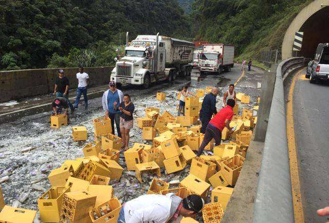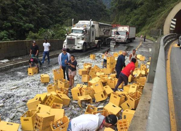 En la provincia de El Oro, un camión que transportaba cerveza se accidentó y decenas de jabas cayeron sobre la carretera.