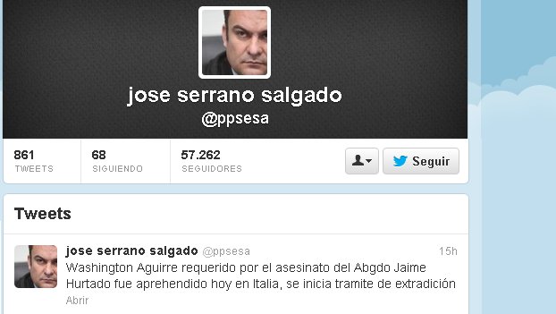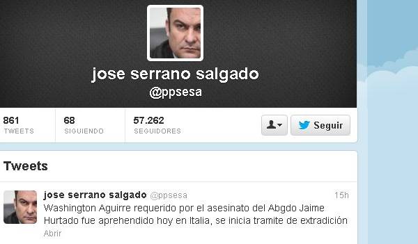 La noche de ayer, a través de su cuenta twitter, el ministro del interior, José Serrano, informaba que Washington Aguirre, requerido por el asesinato de Jaime Hurtado fue aprehendido en Italia y que se iniciaba el trámite de extradición.