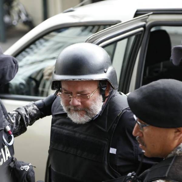 Todo un despliegue de seguridad se pudo observar sobre el detenido, quien llegó a la entidad con un casco, chaleco antibalas y esposado, desde la Cárcel No. 4 de Quito, donde cumple su sentencia de 5 años por cohecho.