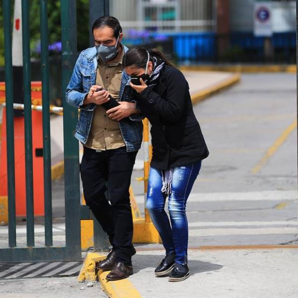 Una pareja con tapabocas fue registrada este lunes a la salida del Hospital Carlos Andrade Marín. Foto: EFE