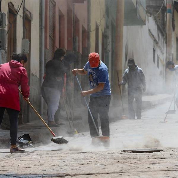 Habitantes barren la ceniza del volcán Sangay en una calle de Alausí, en la provincia de Chimborazo. Foto: EFE/José Jácome