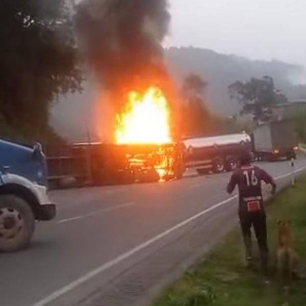 Un choque entre un tráiler y un tanquero de combustible provocó el incendio de este último vehículo en el kilómetro 38 de la vía Alóag - Santo Domingo, en el cantón Mejía, provincia de Pichincha.