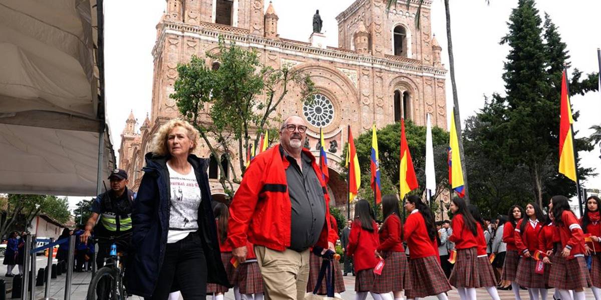 El rojo y amarillo resaltan en el centro de Cuenca y sus alrededores. Son los colores de la bandera de la ciudad, que este 3 de noviembre de 2025 celebra sus 205 años de Independencia. La Catedral de la Inmaculada Concepción constituye uno de los íconos arquitectónicos de la urbe, ubicada al pie del parque Calderón.
