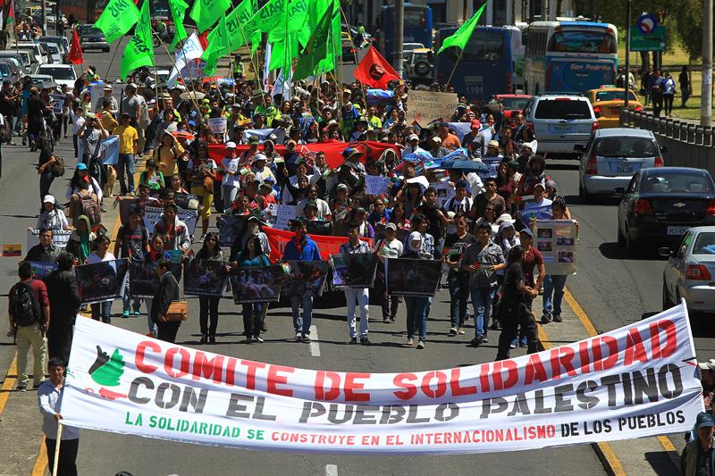 Cerca de 200 ciudadanos protagonizaron hoy en Quito una marcha hasta la embajada de Israel en Ecuador para exigir el cese de los ataques israelíes en la franja de Gaza, que han causado la muerte de más de 750 personas, en su mayoría civiles, desde el 8 de julio.