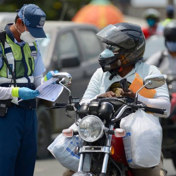 GUAYAQUIL.- Agente de la ATM revisa validez de salvoconducto en el Puente de la Unidad Nacional. Foto: API