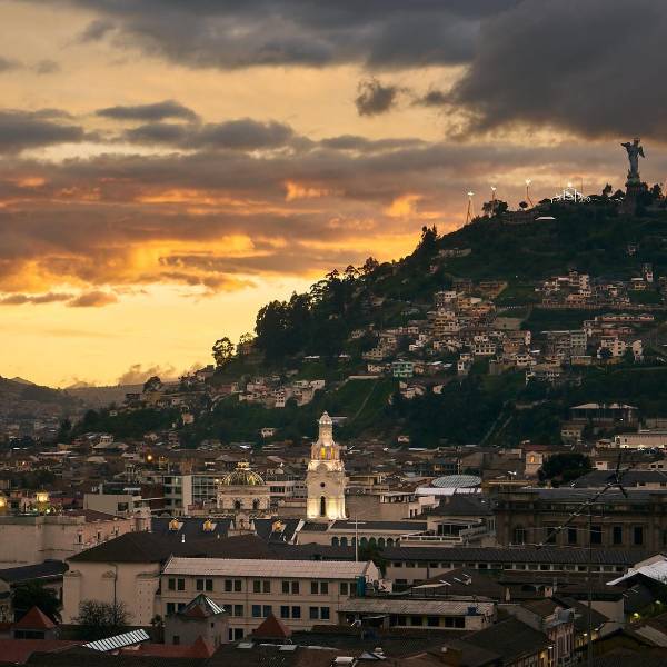 Imagen de atardecer en Quito con la catedral y el panecillo. ( )