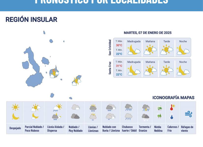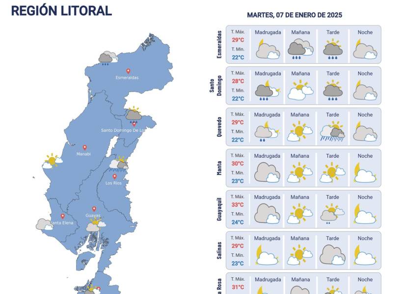 Este martes 7 de enero del 2025 el Instituto Nacional de Meteorología e Hidrología (INAMHI) prevé una mañana despejada en el país, sin embargo, se esperan lluvias de intensidad variable en la Sierra y la Amazonía durante la tarde.