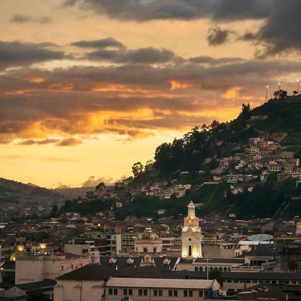 Imagen de atardecer en Quito con la catedral y el panecillo.( )