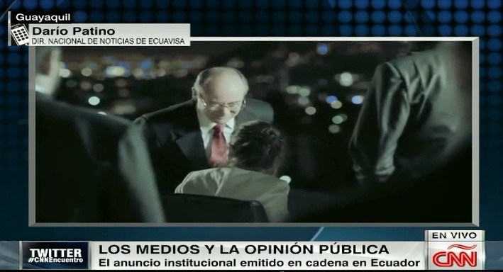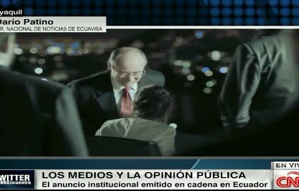 “Ecuavisa hace uso de su derecho a expresarse, y decir, bajo la indicación de protesta, que no está de acuerdo con esa cadena obligada, con el hecho de transmitir una cadena obligada que va contra los sectores de la sociedad y que los estigmatiza negativamente”. Así se refirió el director nacional de noticias, Dario Patiño, en una entrevista concedida al canal CNN en Español, a la difusión del spot denominado “La verdadera libertad”, por parte de la Secretaría Nacional de Comunicación.