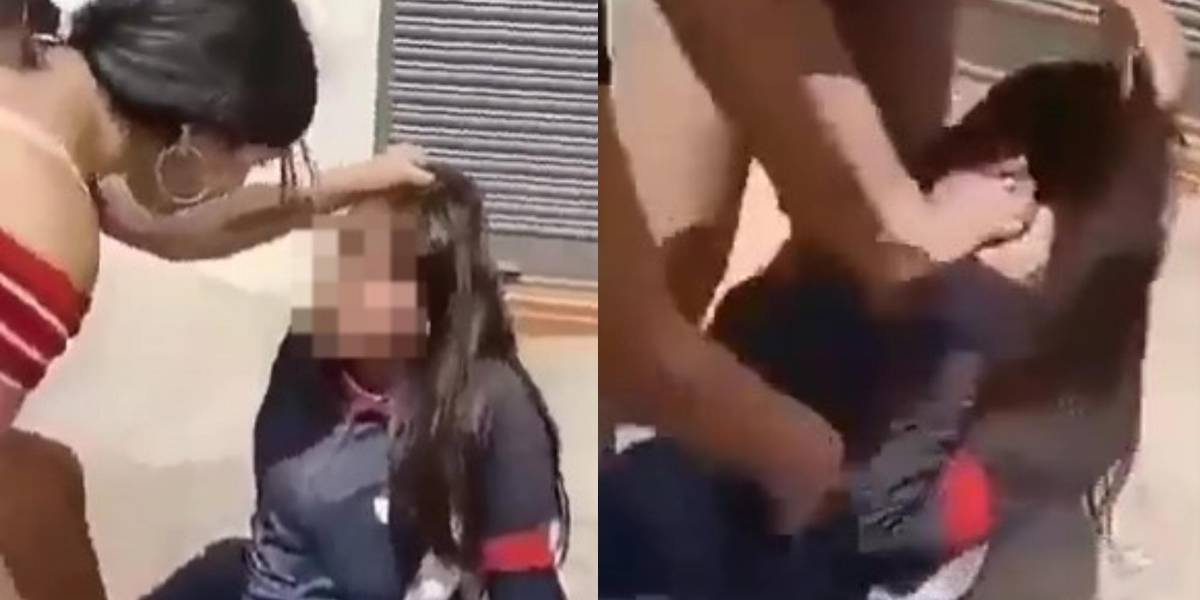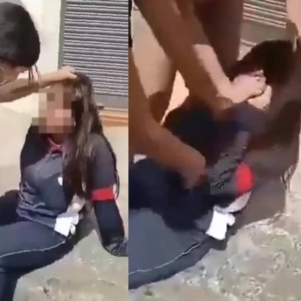 Una tercera persona graba el hecho. Una de las agresores aparentemente lleva un uniforme deportivo del colegio, mientras la otra adolescente lleva un vestido con zapatos deportivos blancos.