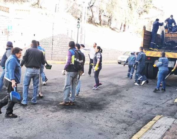 Personal municipal y ciudadanos limpian calzadas en Quito. Foto: DMQ -