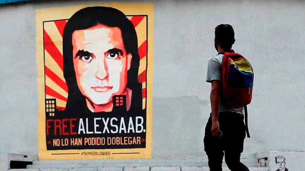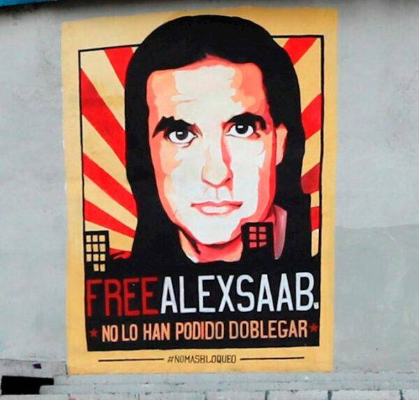 Cartel de apoyo al empresario colombo-venezolano Alex Saab, en Caracas (Venezuela). 17 de octubre de 2021 - Foto: EFE