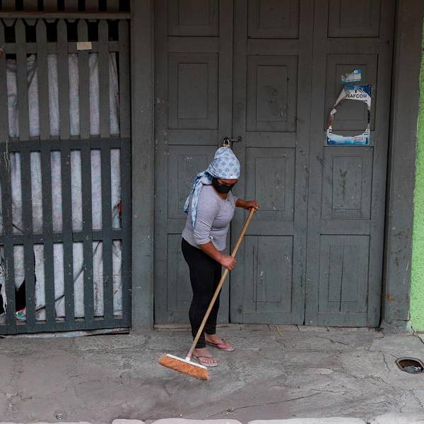 Una mujer barre hoy la ceniza del volcán Sangay a la entrada de su casa en Alausí. Foto: EFE