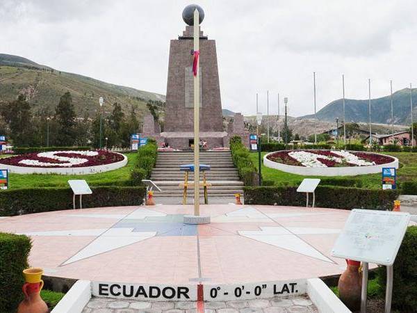 El famoso monumento a la mitad del mundo que construido entre 1979 y 1982 para marcar el punto donde se creía que el Ecuador atravesaba el país en aquel momento