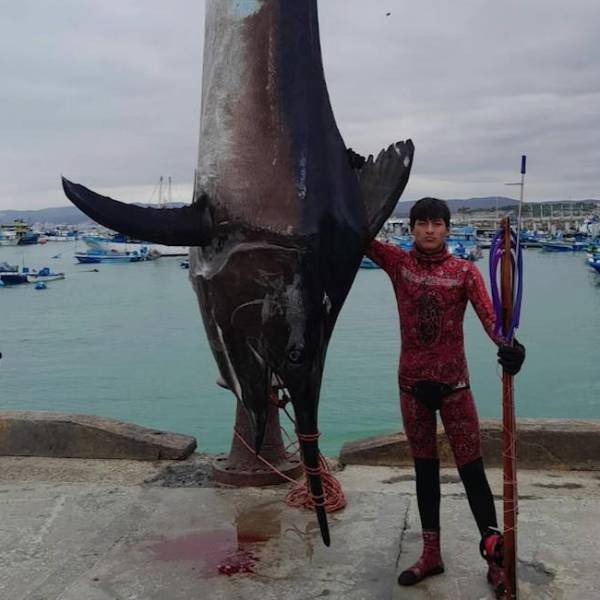 Sin tanque de oxígeno, y sin más ayuda que un arpón, atrapó un pez que mide casi tres veces su estatura: cinco metros de largo.