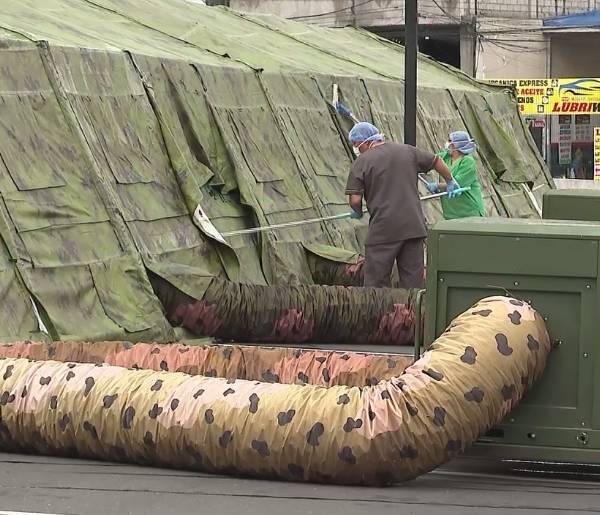 En el hospital del IESS Quito Sur, las Fuerzas Armadas instalan un hospital móvil para albergar a pacientes con COVID-19 en caso de que los casos de contagio rebasen la capacidad de atención.
