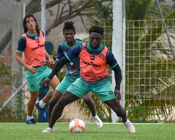 Roberto 'Tuca' Ordóñez mira el balón fijamente en una práctica del club. Foto Twitter Delfín.