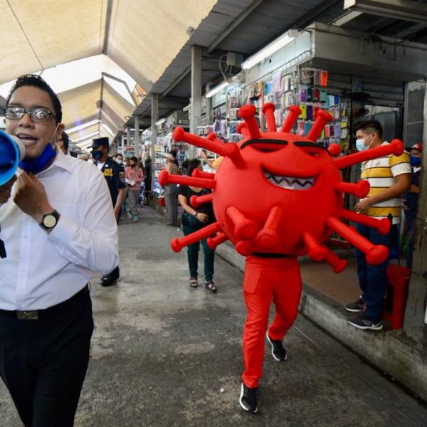Agentes de la Policía Nacional y Policía Metropolitana, acompañados por funcionarios del Cabildo y "Covito", un personaje que representa al COVID-19, recorrieron los estrechos callejones de La Bahía indicando los riesgos mortales que representan las aglomeraciones y más cuando los peatones no usan mascarillas.