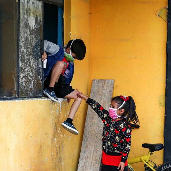 Niños con mascarillas juegan en Quito. Foto: EFE