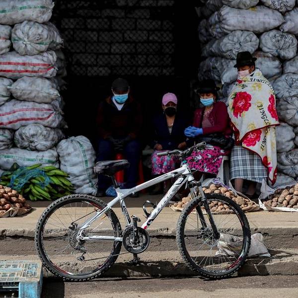 Vendedores ecuatorianos con mascarillas ofrecen sus productos en el Mercado Mayorista, en Quito. EFE