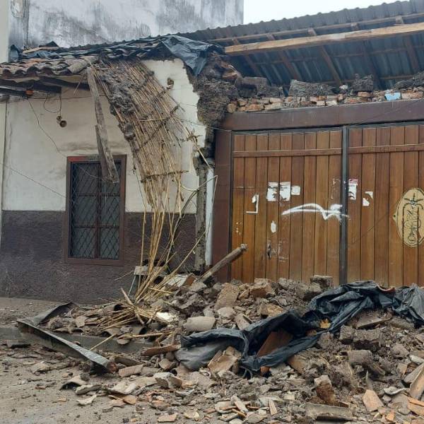 Un ruido inusual alertó a los transeúntes que pasaban por las calles Sucre y Hermano Miguel, en Cuenca, la tarde del 28 de diciembre. En segundos, el alero de una vivienda patrimonial colapsó y se desprendió casi en su totalidad.