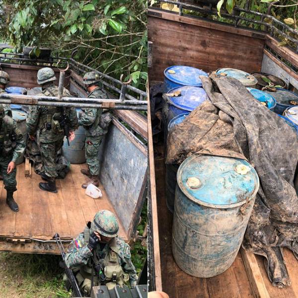 En otro operativo, personal de la Fuerza de Tarea Conjunta “Esmeraldas” decomisó 605 galones de combustible que fueron abandonados por presuntos delincuentes en el sector de Corriente Larga, en Esmeraldas.